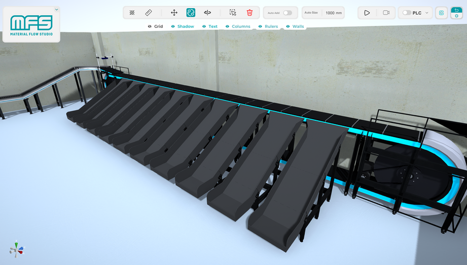 A vertical-loop crossbelt sorter uses carriers with independent belt modules to discharge items left or right into chutes. It supports a wide range of package sizes with gentle handling at high throughput. Carrier speed and induction points determine capacity; this setup defines 100 destination chutes. Integrates with upstream conveyors, DWS, and WMS/WCS for batch waves and dynamic recirculation. Typical process areas: inbound (goods receipt & check-in), item sorting (order consolidation, put-to-zone), outbound (shipping waves), and returns handling.